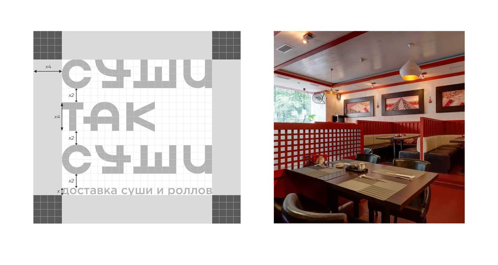 Для логотипа было разработано авторское начертание. Вдохновением послужил классический японский интерьер ресторанов - прямые линии, квадраты, минимализм.